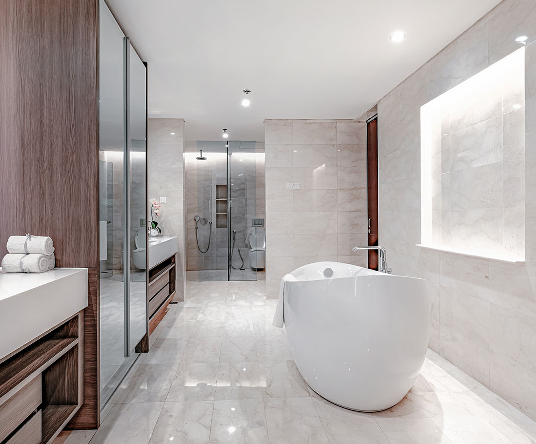 FloorHigh Quality Local MarbleWallHigh Quality Local MarbleCeilingPainted Gypsum BoardDoorsTimberSanitary Ware & FittingsKohler and GroheSafety FeaturesSmoke, Heat & Gas Detectors, Fire Alarm & SprinklersHot Water SupplyElectric Water Heater