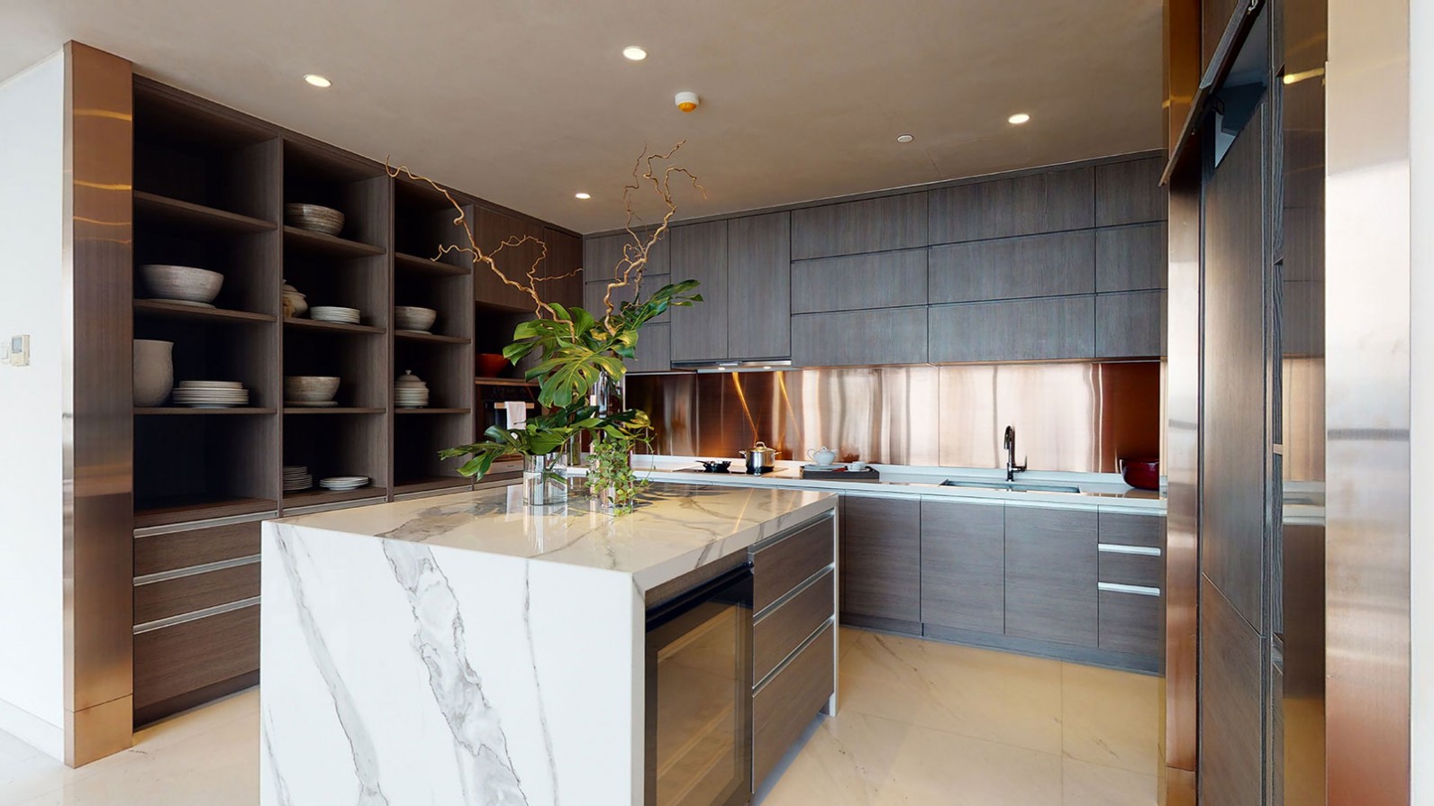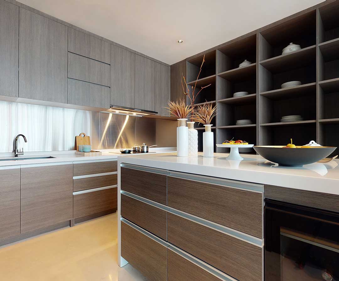 FloorHigh Quality Imported MarbleBench Top Splash BackHairline Stainless SteelCeilingPainted Gypsum BoardKitchen CabinetBuilt-In Kitchen Cabinet with HPL FinishKitchen AppliancesCooker, Cooker Hood, Oven, Wine Cooler, and Built-in Refrigerator by MIELESafety FeaturesSmoke, Heat & Gas Detectors, Fire Alarm & SprinklerAir ConditioningDucted System by ToshibaWater HeaterElectric Water Heater